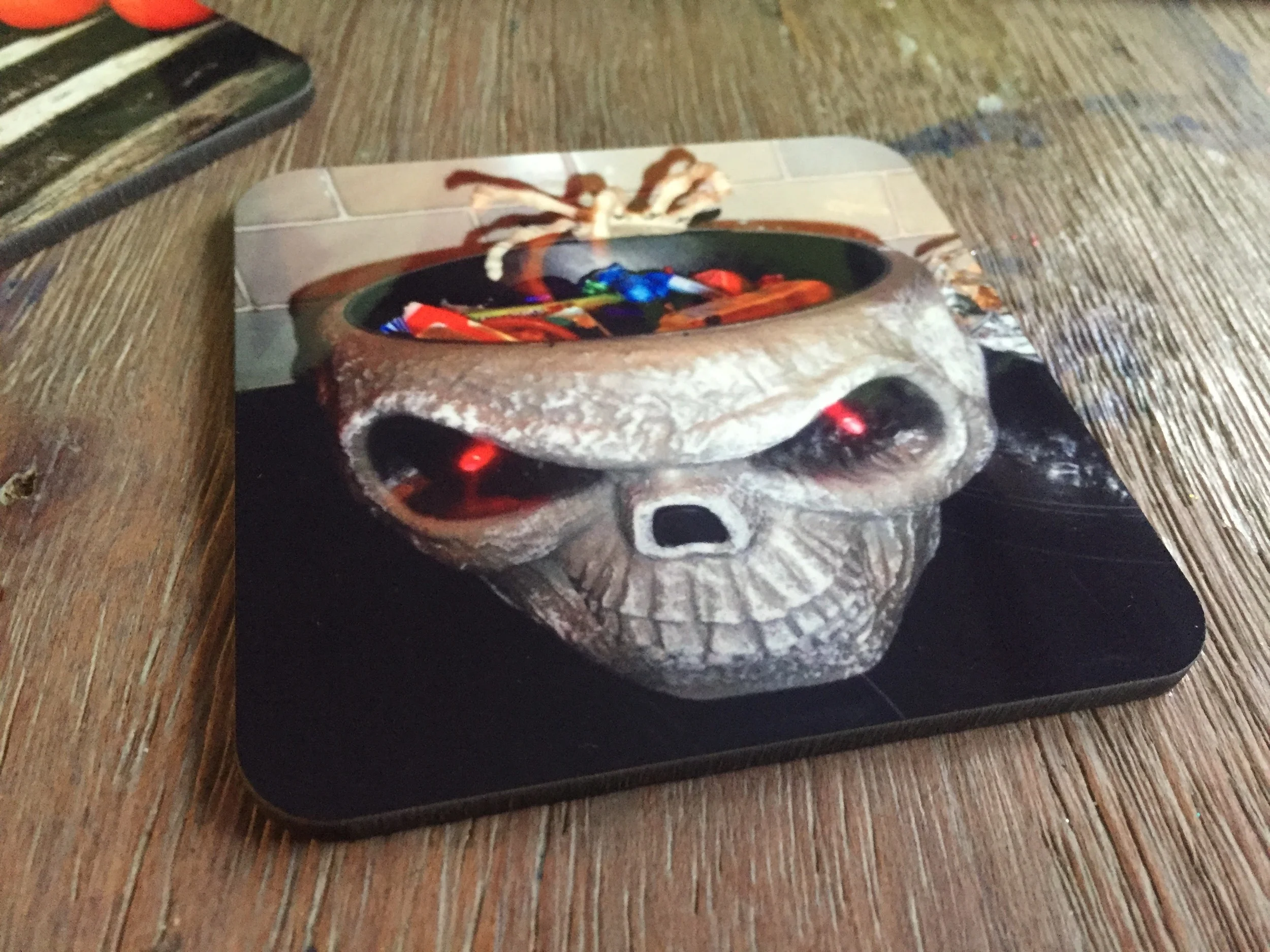 For my table set-up I have Halloween themed bowls, plates, cups etc. but I wanted something new to add to my growing Halloween bits, thus, we had a little fun making and ordering from SnapFish some spooky themed coasters - perfect to use for our Halloween parties.