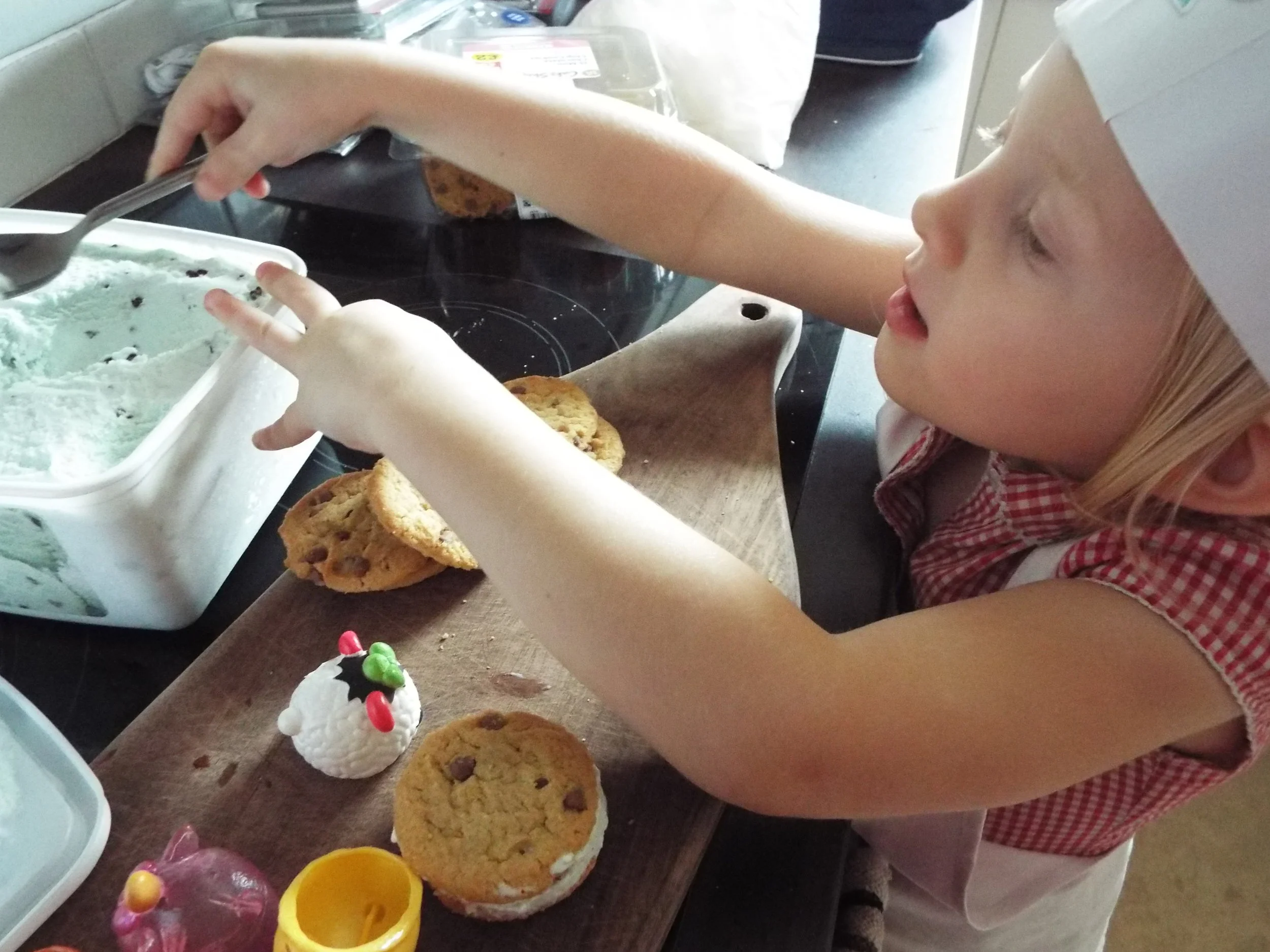 Summer scooping the mint choc chip ice-cream, ready to spread onto the cookies.