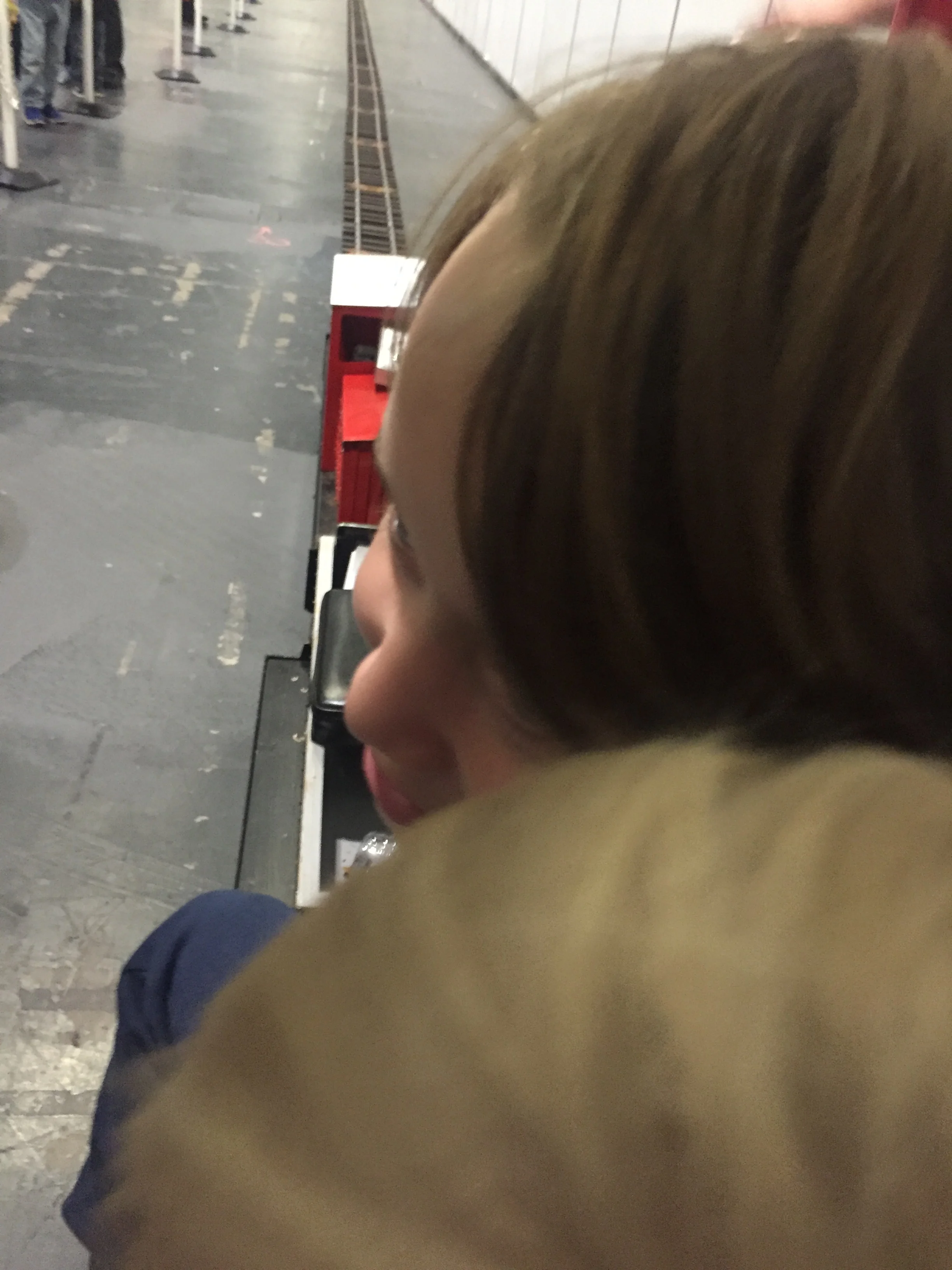 The kids really wanted to go on the mini train. He slowly went up the laid down track and back down again.