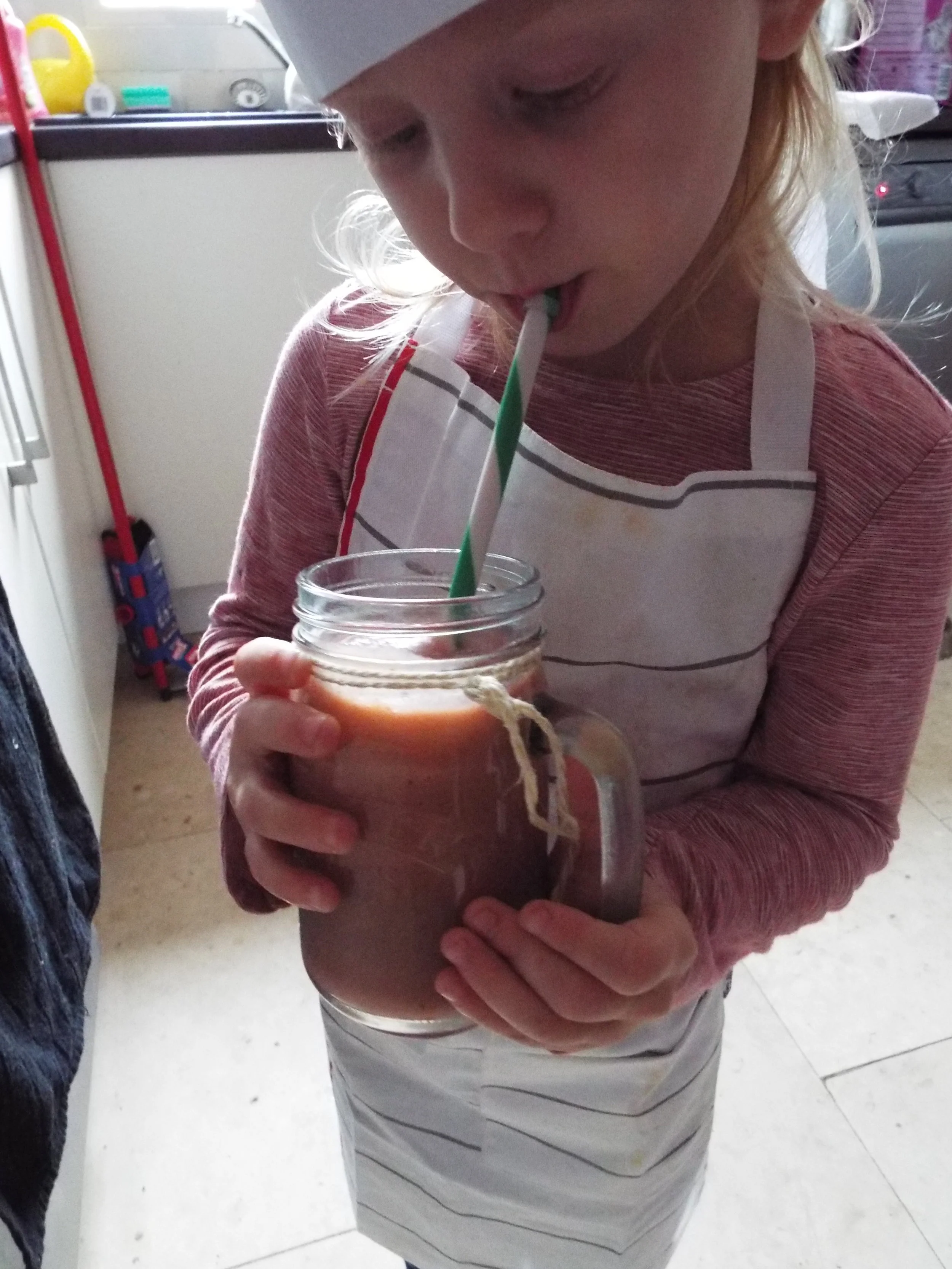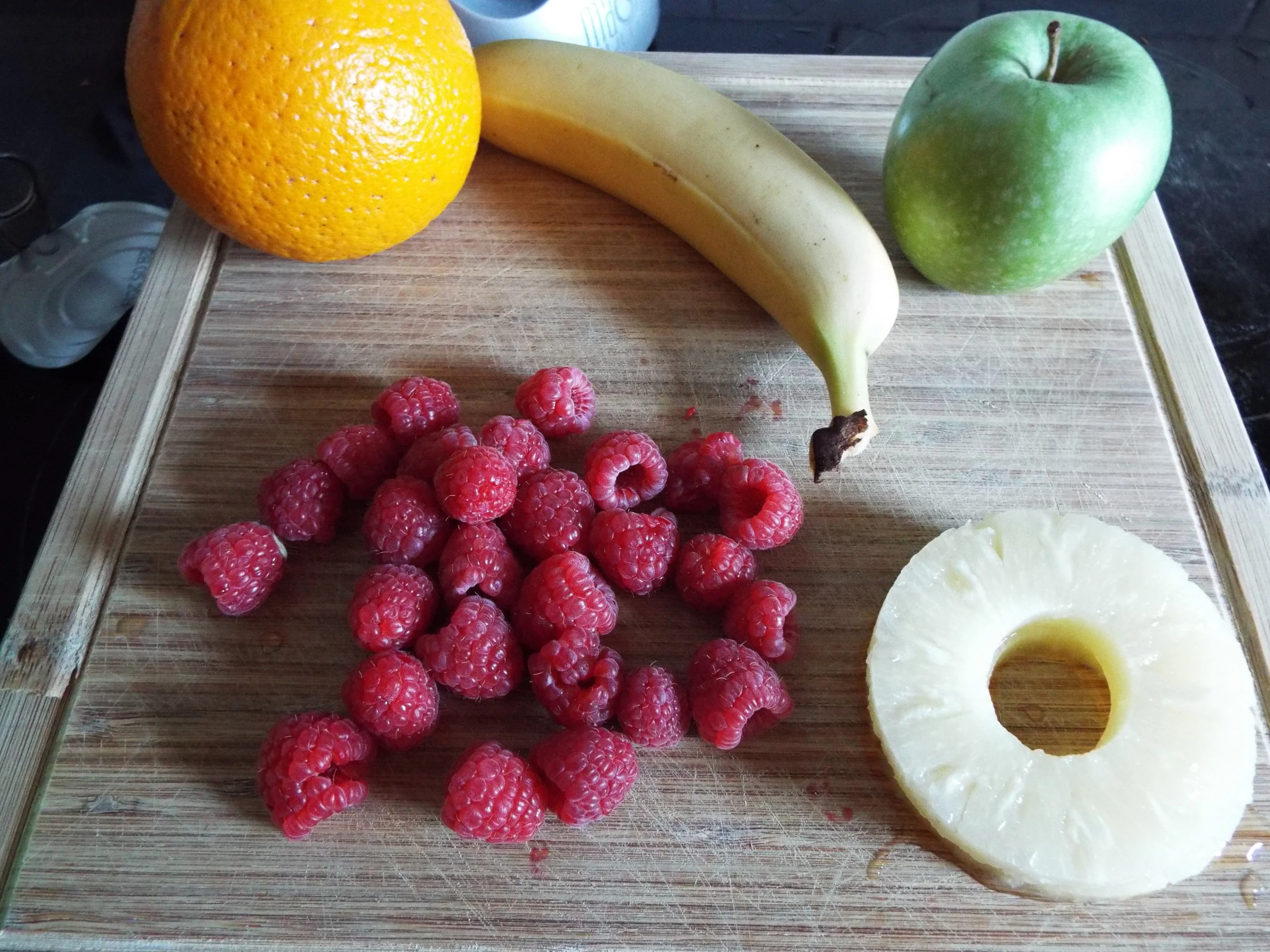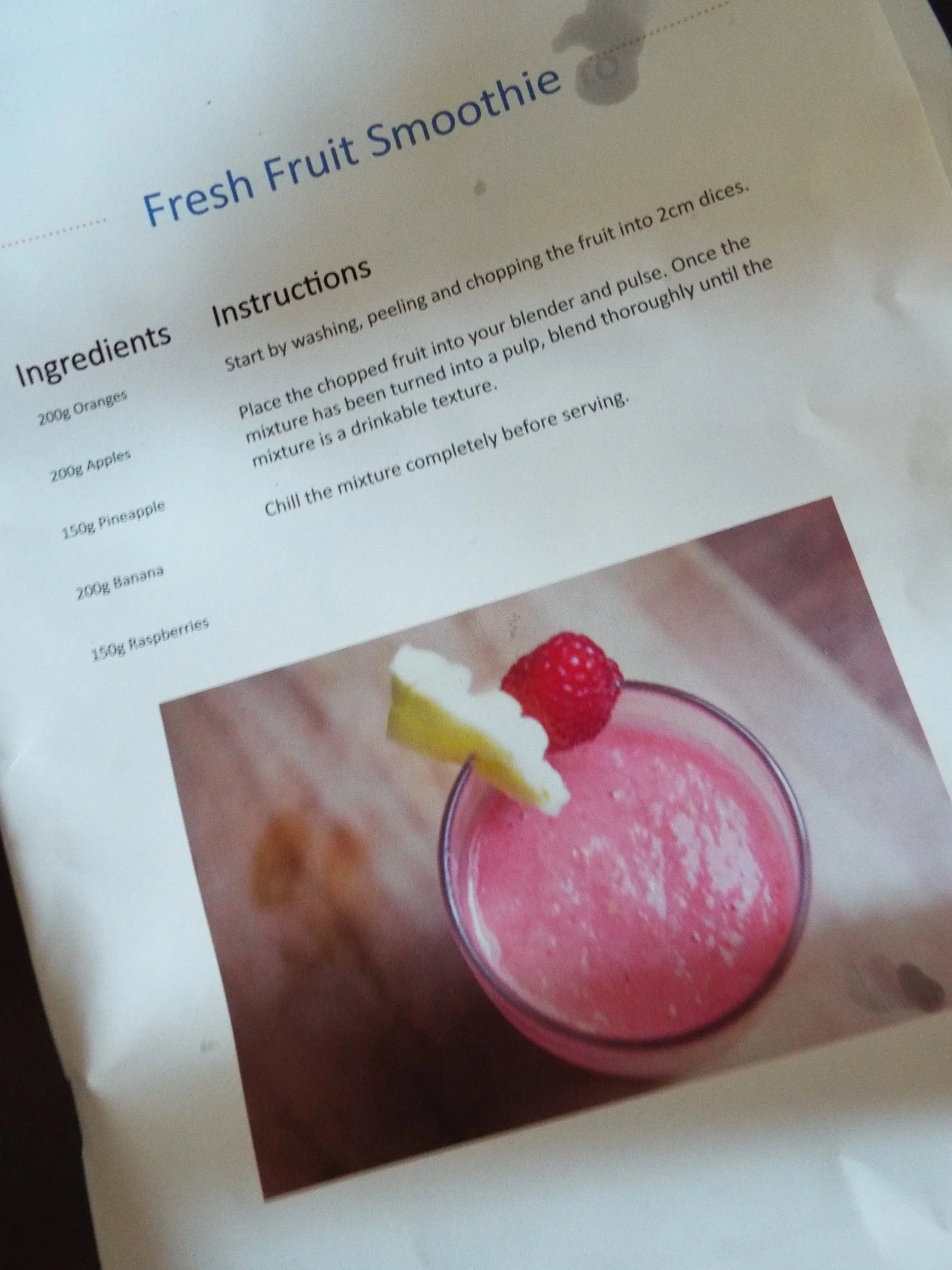 We diced all the fruit up, placed it in our smoothie maker, mixed it all up and once smooth, poured it into a glass, added a straw and drank.