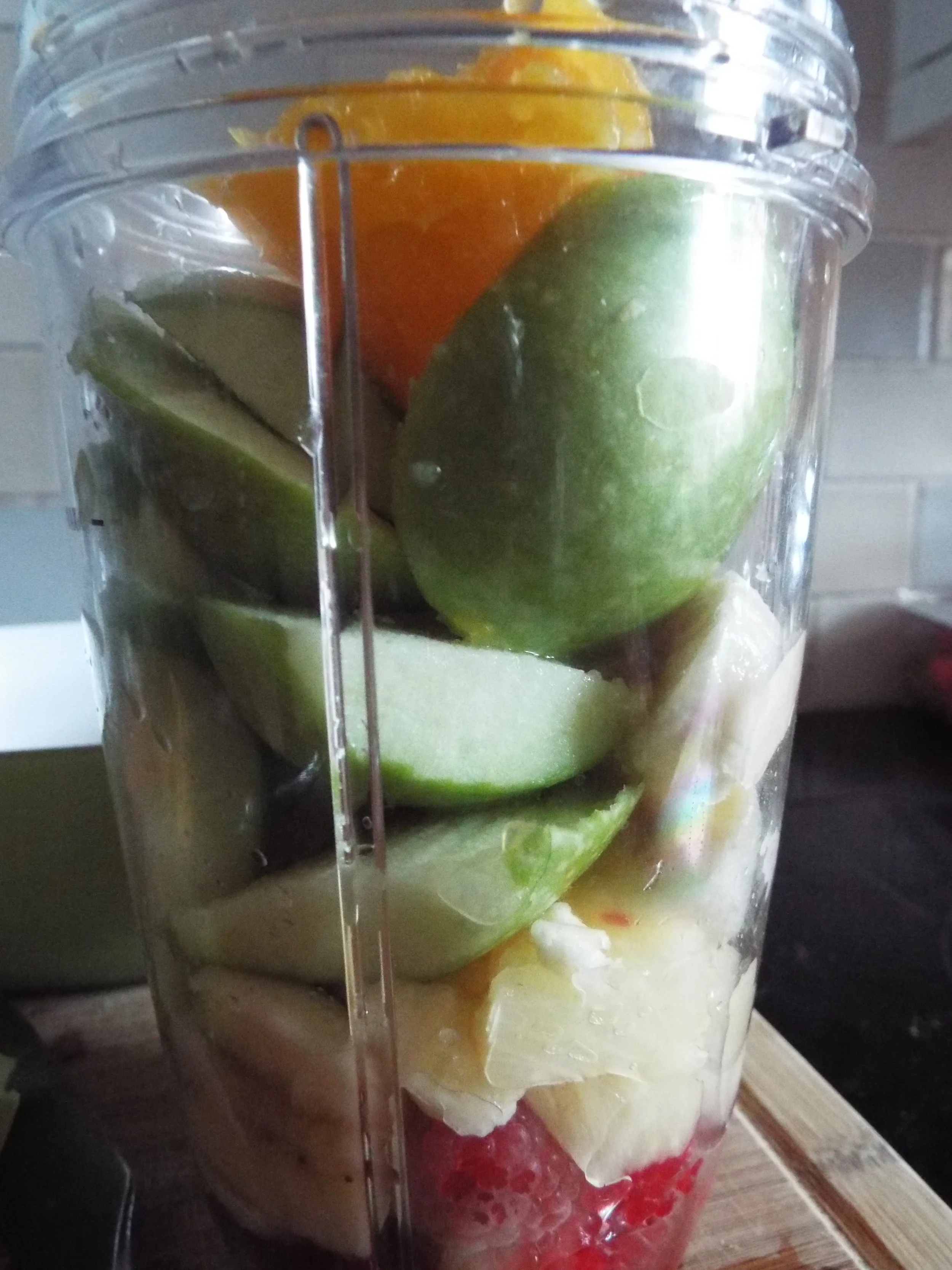 We pilled all the fruit in to the cup to put on the smoothie maker.