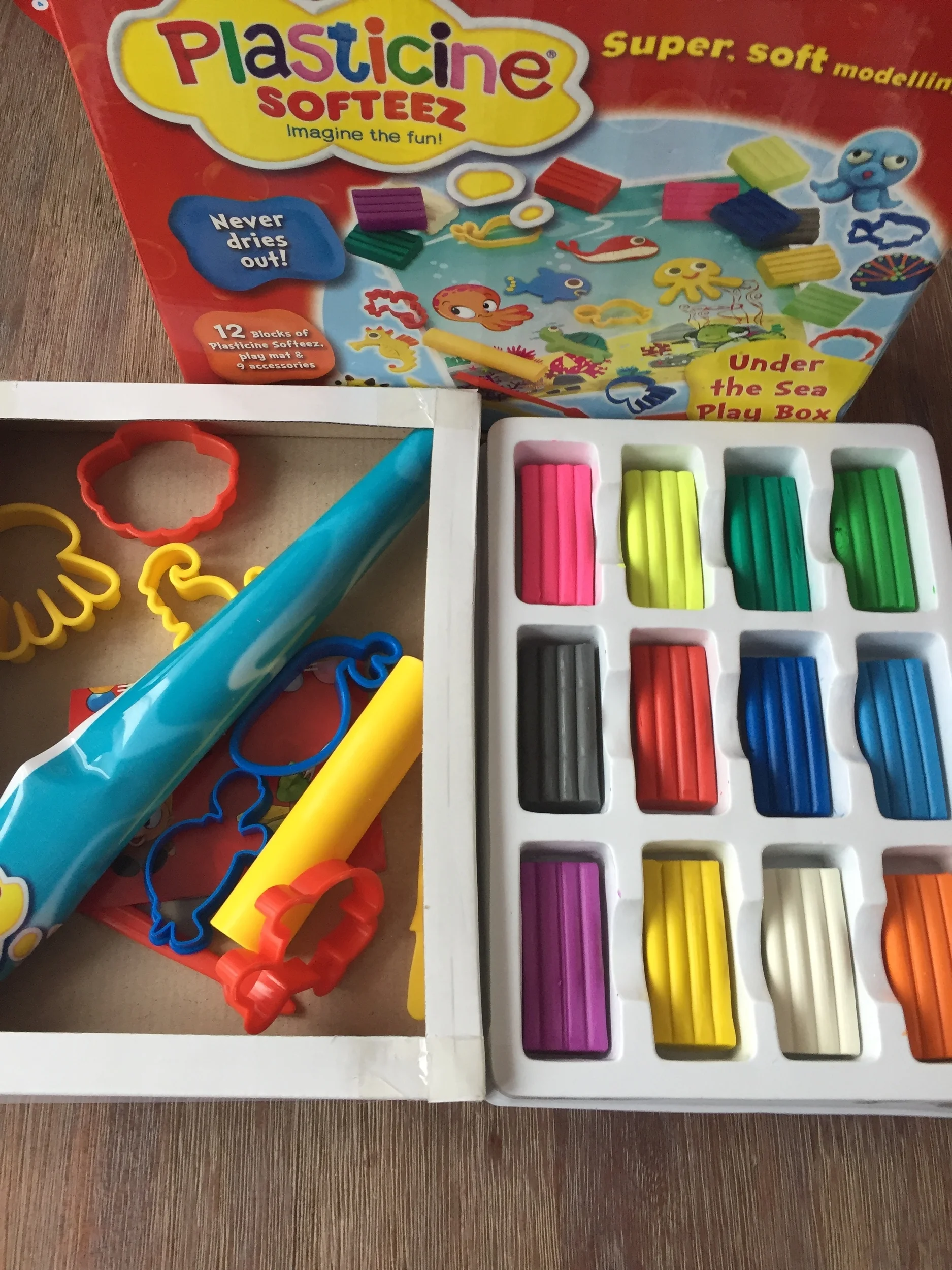 Plasticine Under The Sea Softeez Play Box is loads of fun, the box is packed full of 12 slabs of Softeez. Includes, fun underwater themed play mat, 6 Ocean Animal Themed Cutters, 2 Modelling Tools and 1 Roller. The kids had tons of fun cutting up the different sea animals and placing them on the brightly coloured theme play mat. They also used the modelling tools and rollers to help them.