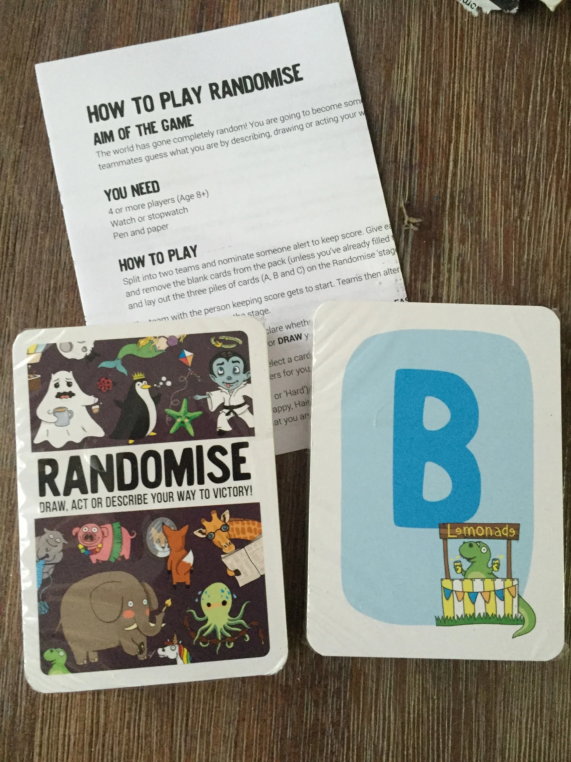 Randomise is a mix of classic games, Charades, Articulate and Pictionary, with complete randomness thrown in. This is a great game that can be played with the family and/or friends, and has a recommended age of 8 years +. You need at least 2 teams, thus, at least 4 people to play.