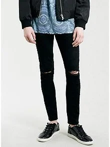 Topman black stretch skinny jeans feature raw ripped knees which is current at the moment. A stretch skinny fit, that is made from comfortable stretch denim with a normal rise and waist with legs that taper nicely into a skinny. RRP £40 these are excellent value for money. I've always had good experience with Topshop jeans.
