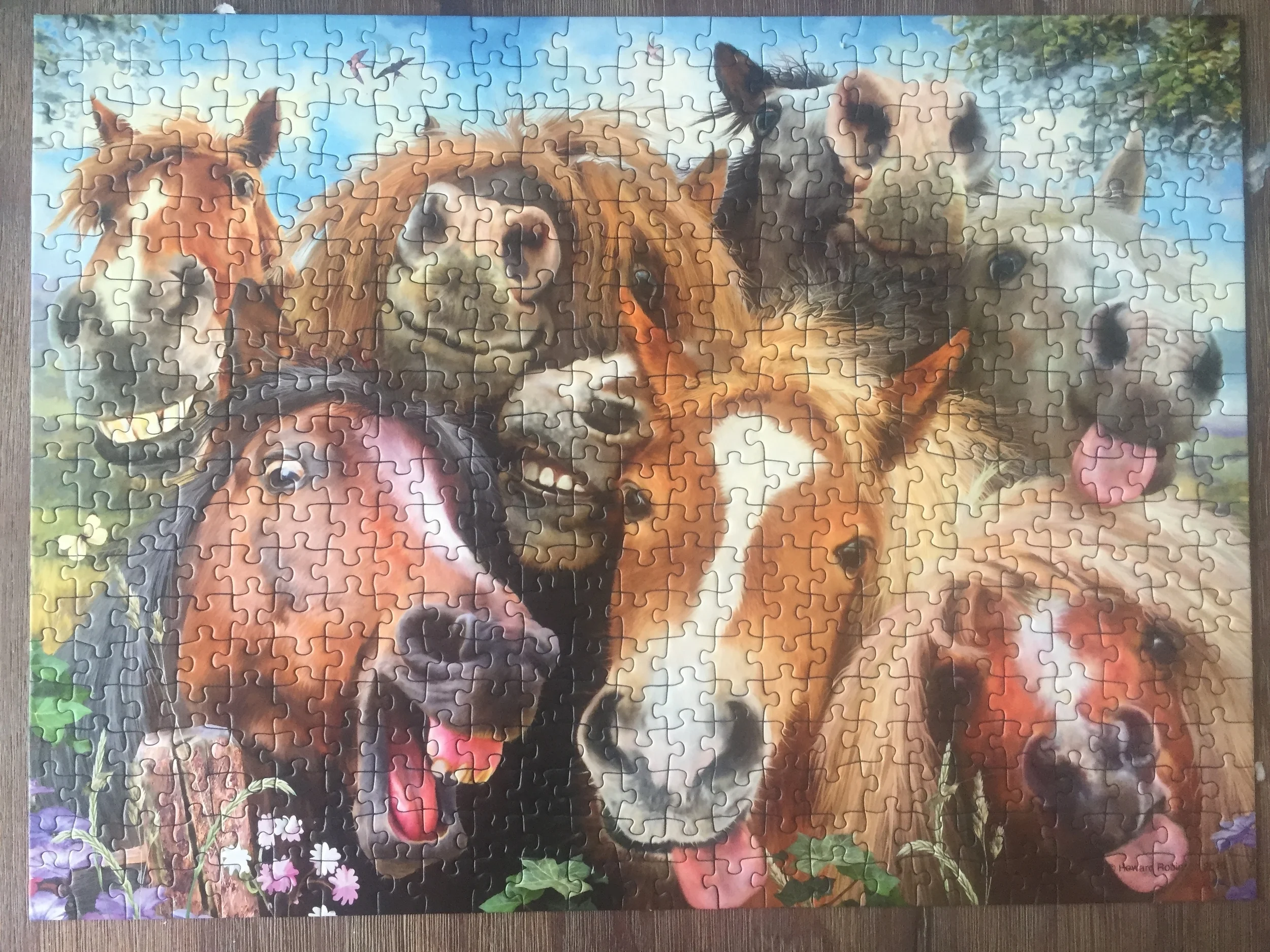 For the people that like to take selfies, likes animals (cheeky selfie taking animals) and enjoy puzzles, then, this is the puzzle for you. This fun Horsing Around puzzle from Ravensburger, designed by artist Howard Robinson, is challenging puzzle, rewarding and great fun.