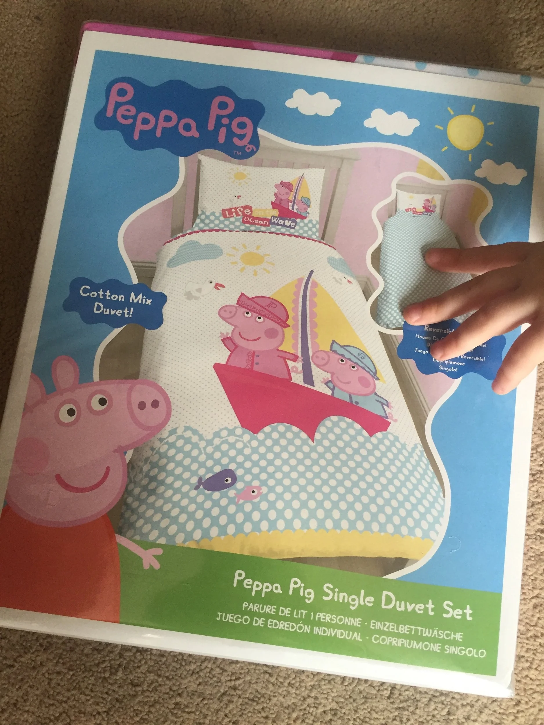 Summer loves her new duvet set (cover and pillow). it's beautifully colourful and fun. It's reversible, one side has Peppa and George sailing the ocean waves and the back has white polka dots. The included pillow matches the duvet.