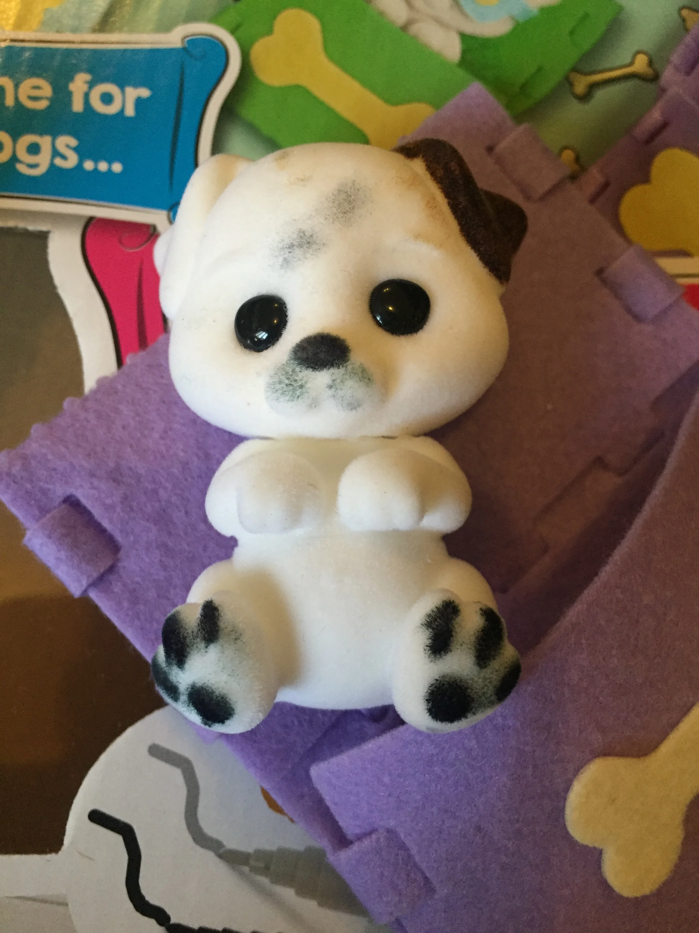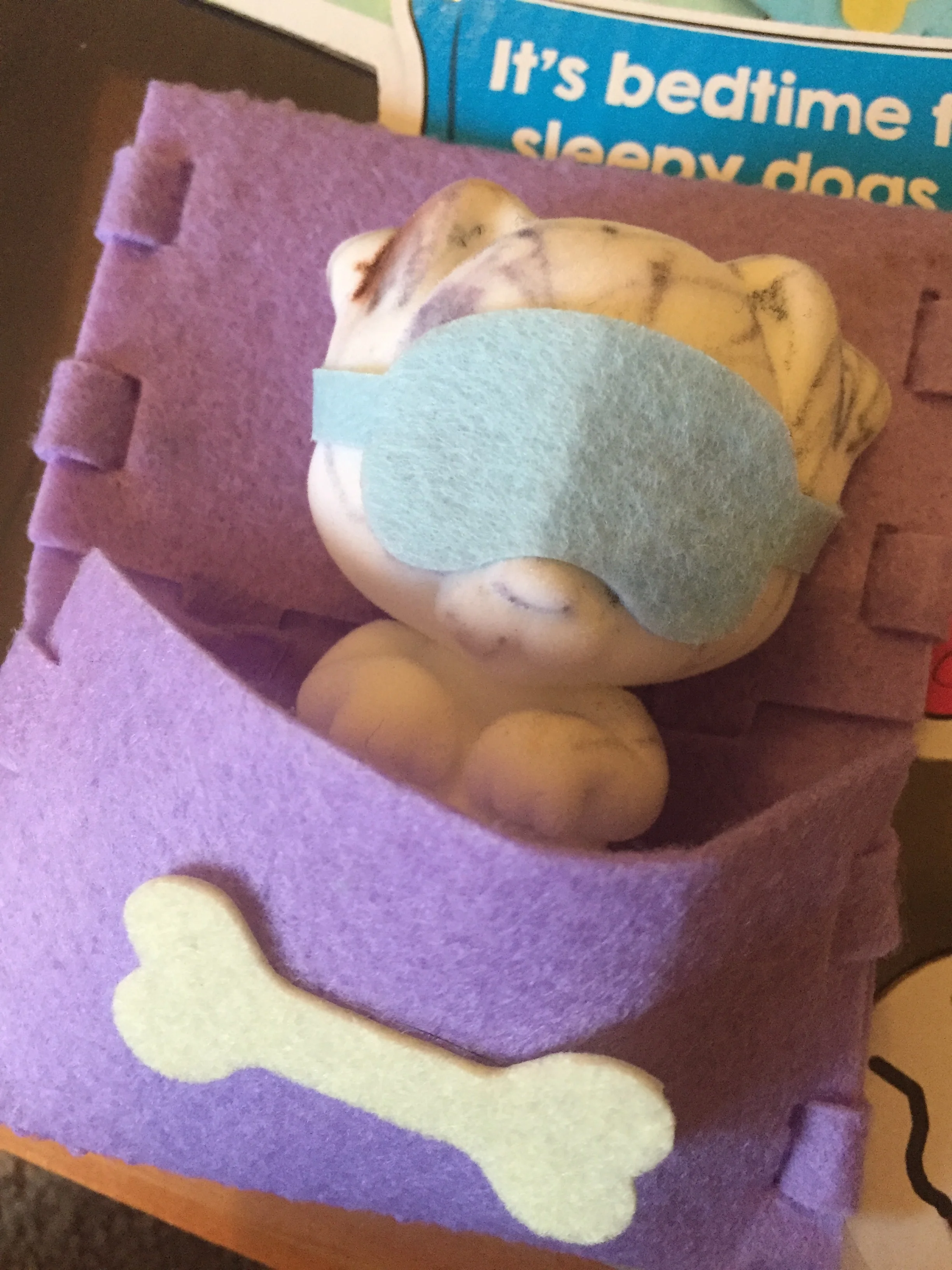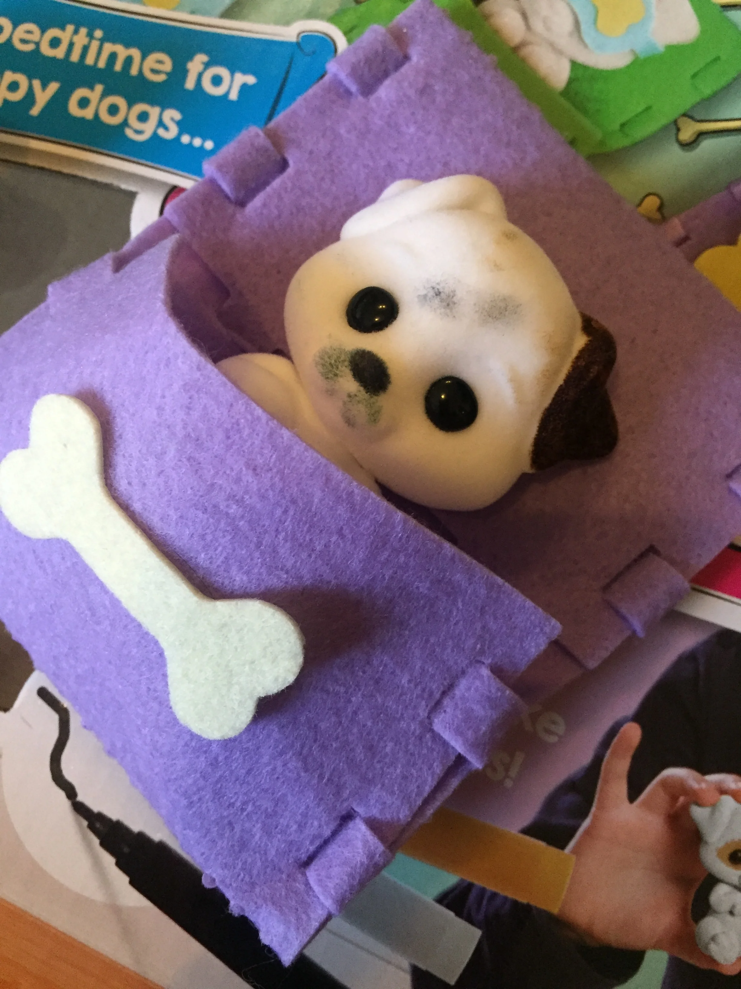 After the colouring in we then accessorised the dog and their beds. First, we popped an eye mask to get them ready for their beds, and we decorated their beds with the included stickers.