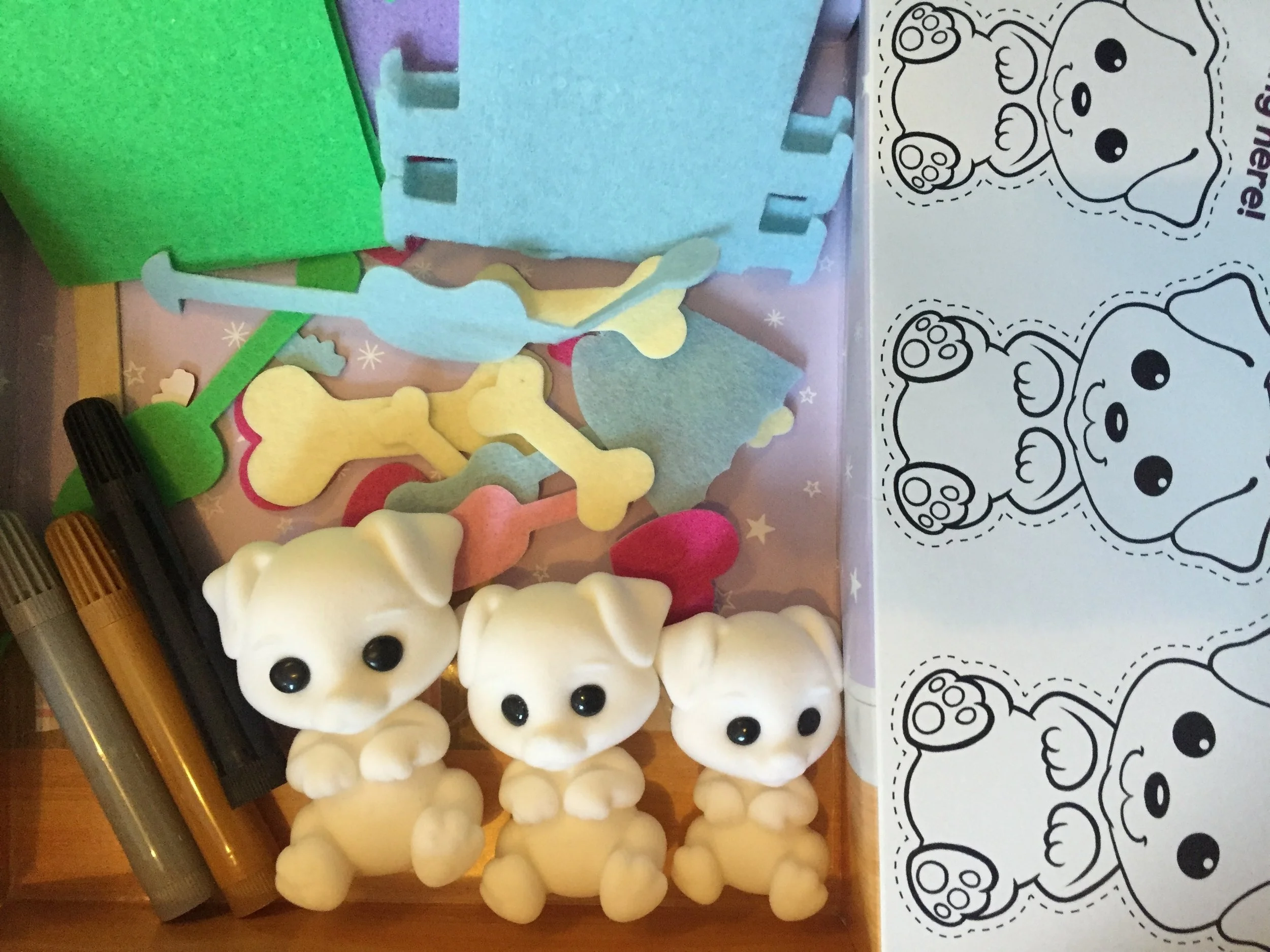 The set includes three different size dogs (small, medium and large), three felt tip pens (black, brown and grey), self-assembly felt beds, stickers to customise your dogs and their beds, wooden lollipop stick and instructions.