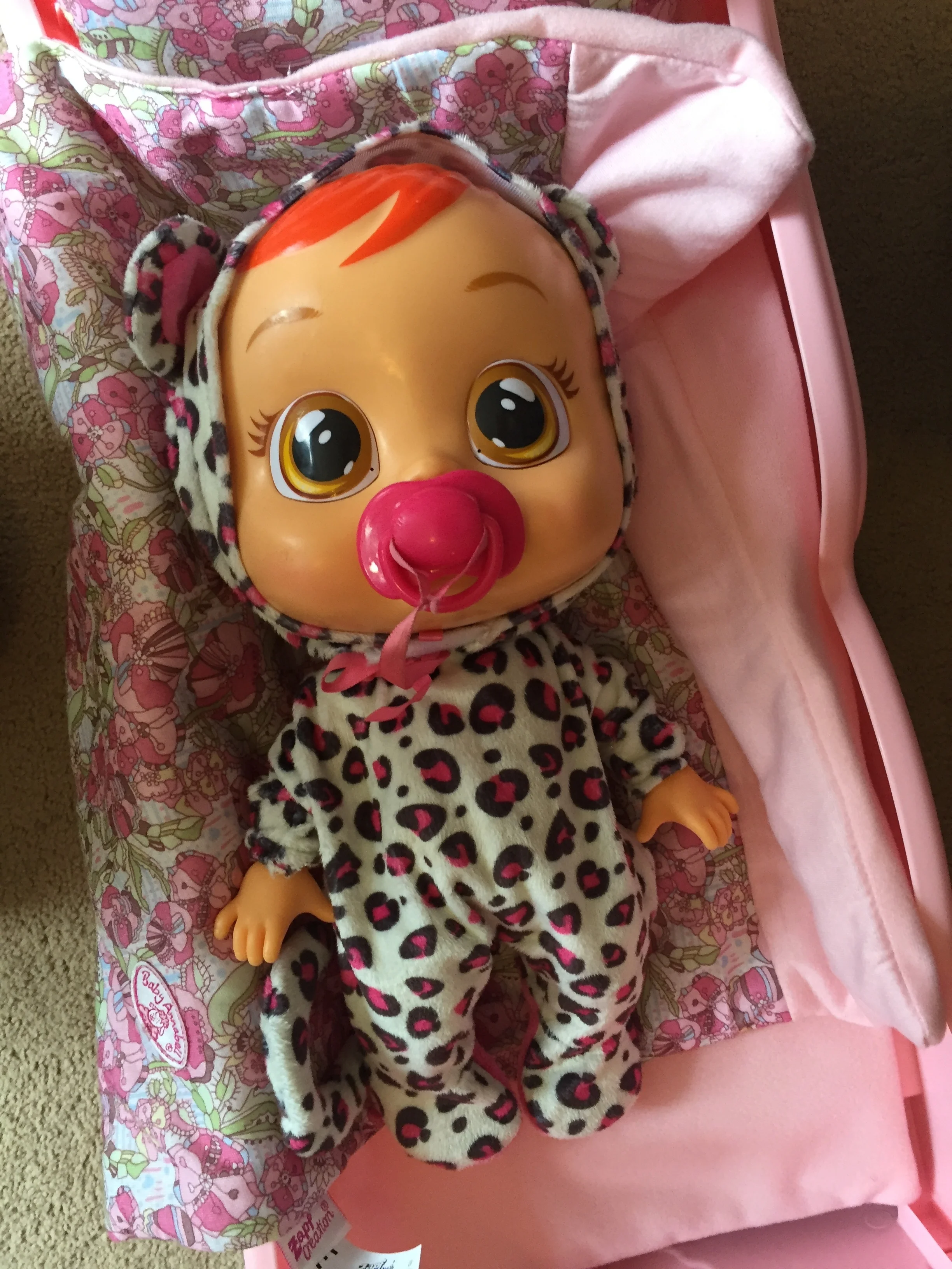 Cry Babies cry real water, you push the button on the back of her head and Lea cries out real tears. If you are not quick to soothe her, by putting her dummy in and cuddling her, she will cry more and more. She makes lots of different baby noises; lots of cooing, suckling and crying.