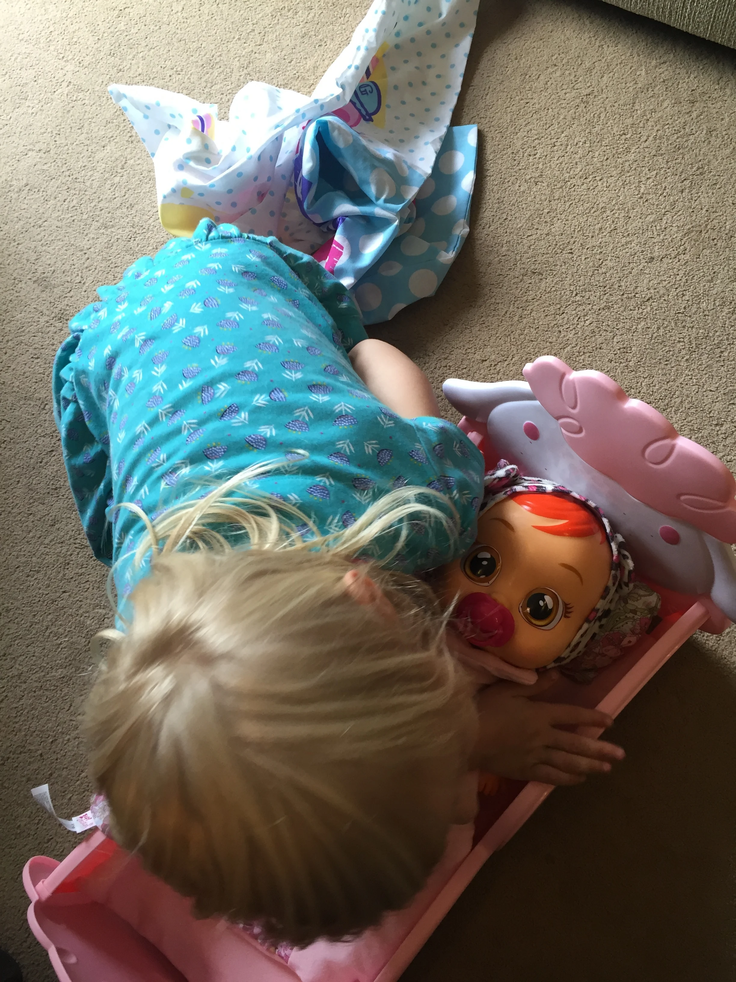 Summer enjoys putting her in the doll cot and rocking her, soothing her to stop the crying.