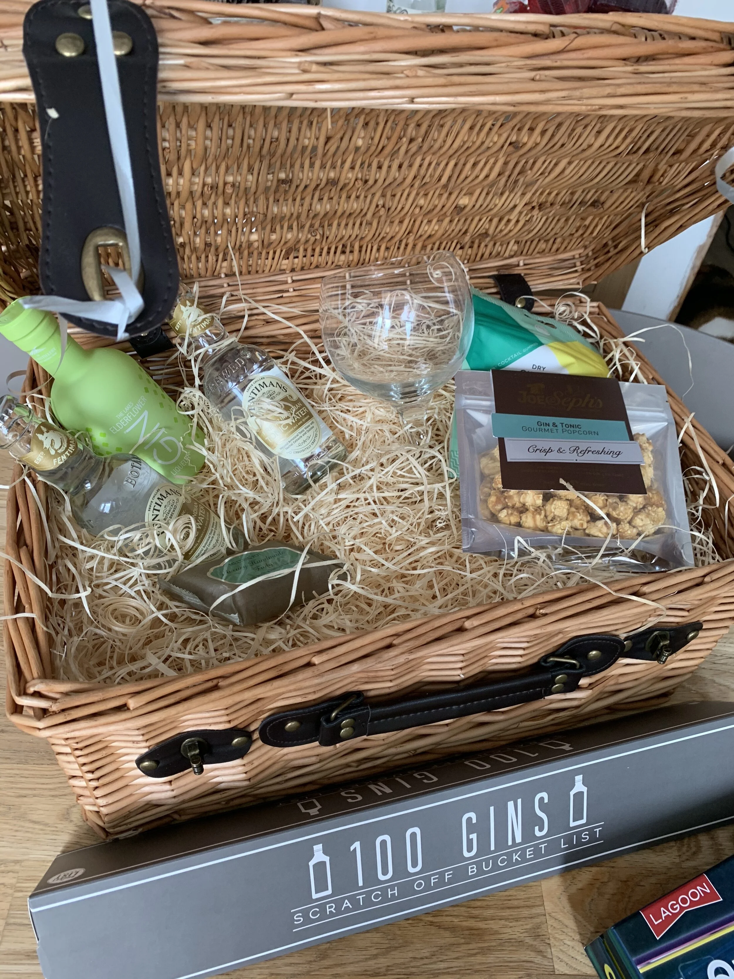 Included in the fabulous wicker gin hamper basket is: