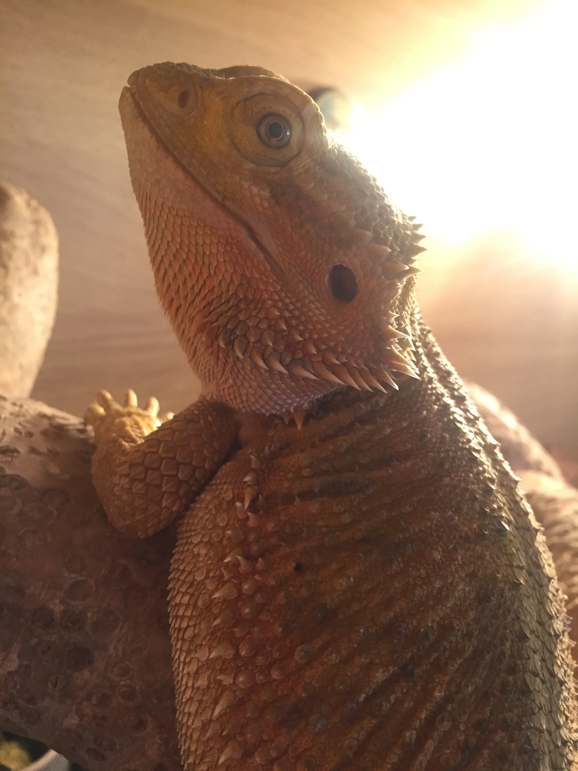 Out of all the reptiles, beardies are the most docile, they are quite easy to handle, and our Shadow loves sitting on your shoulder, or on your lap (he loves all the fuss). His claws can get quite sharp, so we placed slate tiles in the bottom of his cage and we found this effectively and naturally files his claws down.