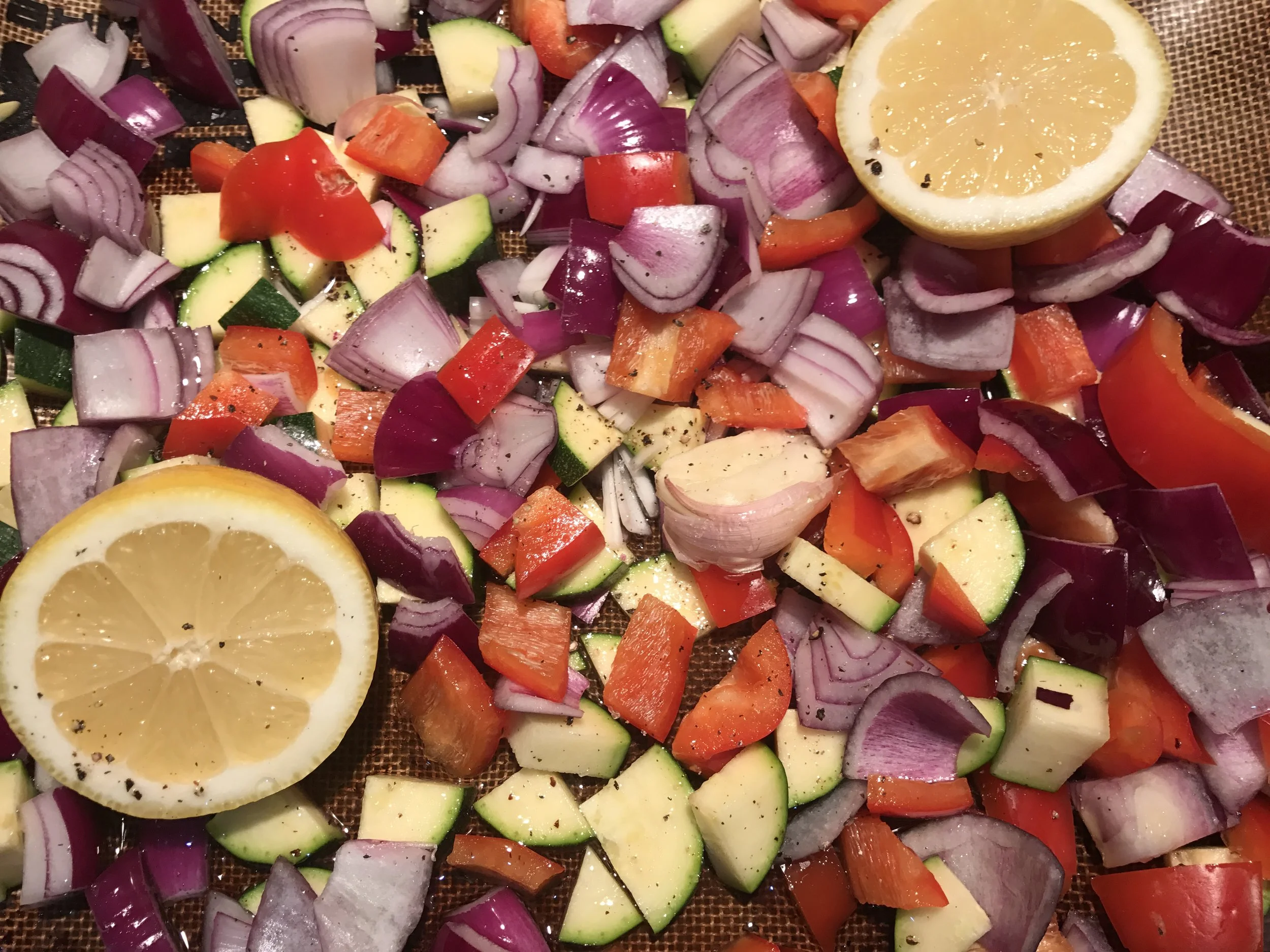 Place the onion, pepper, courgette, lemon (cut side up) and garlic clove onto the preheated roasting tray. Toss with the olive oil and season before roasting on the top shelf in the oven for 20 minutes, it should all be just soft and slightly charred.