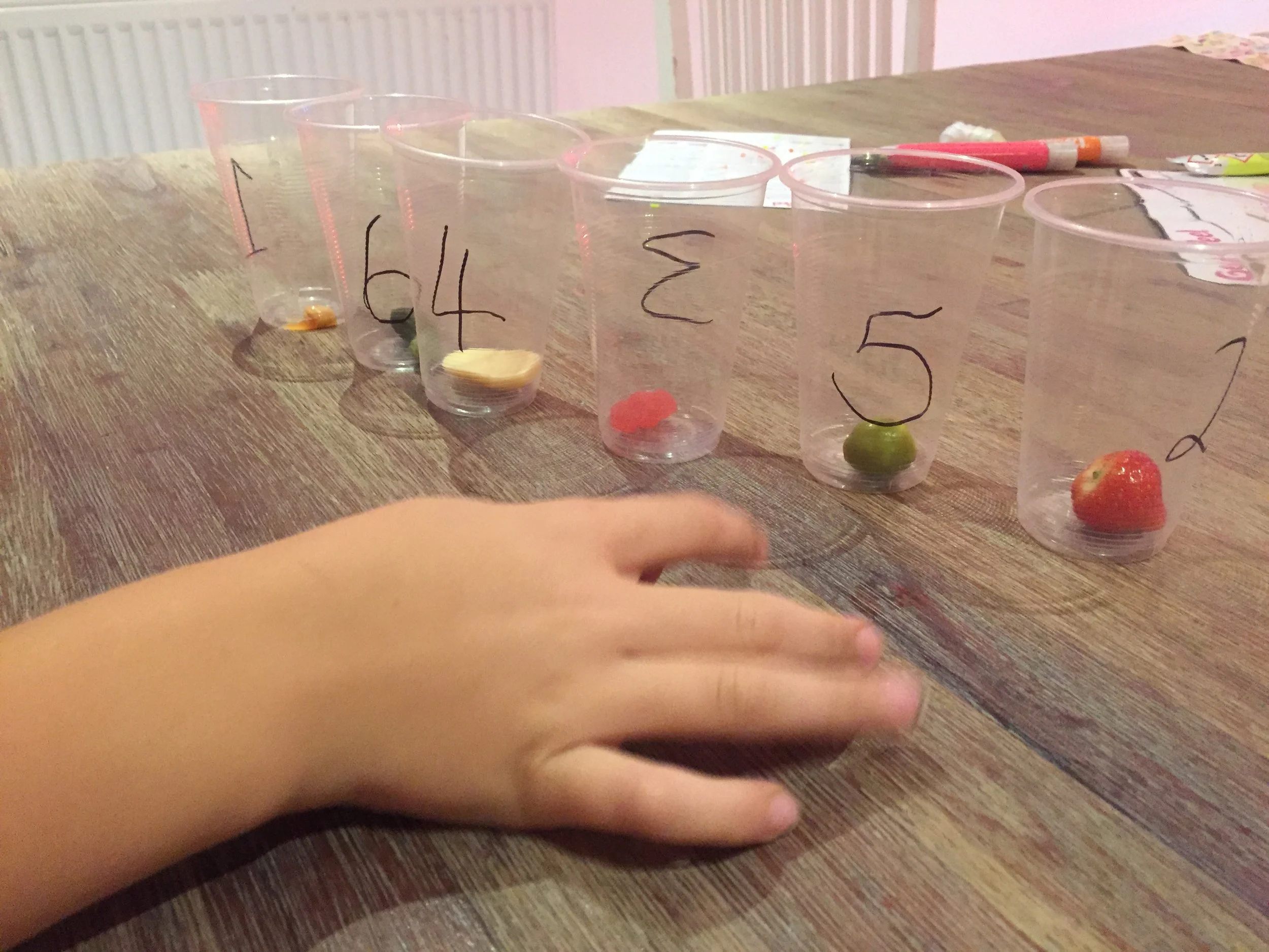 We got 2 sets of 6 cups each and placed 3 yummy treats (chocolate, strawberry, and a gummy bear) and 3 yucky treats (pickled gherkin, an olive, and a cold baked bean).