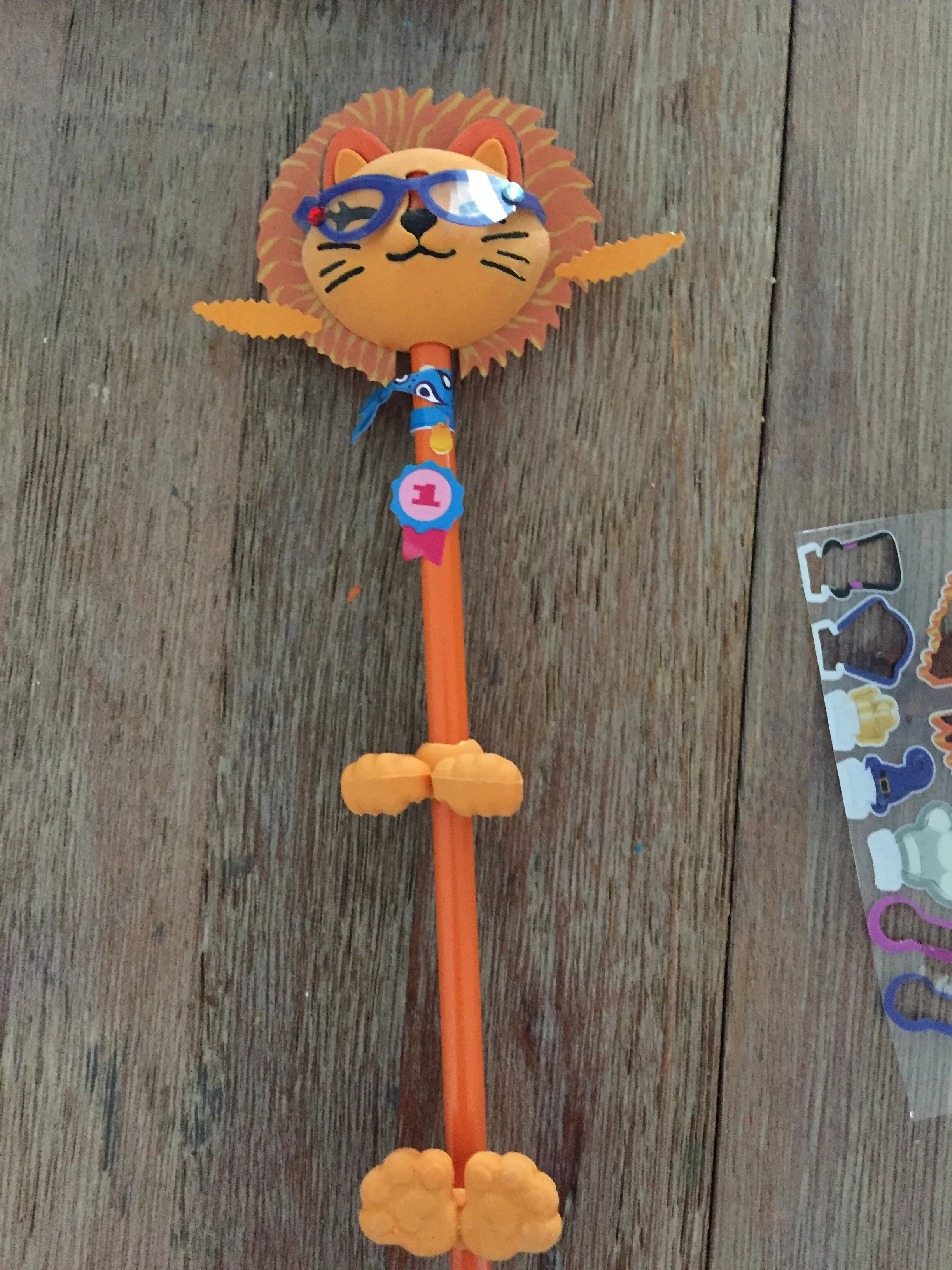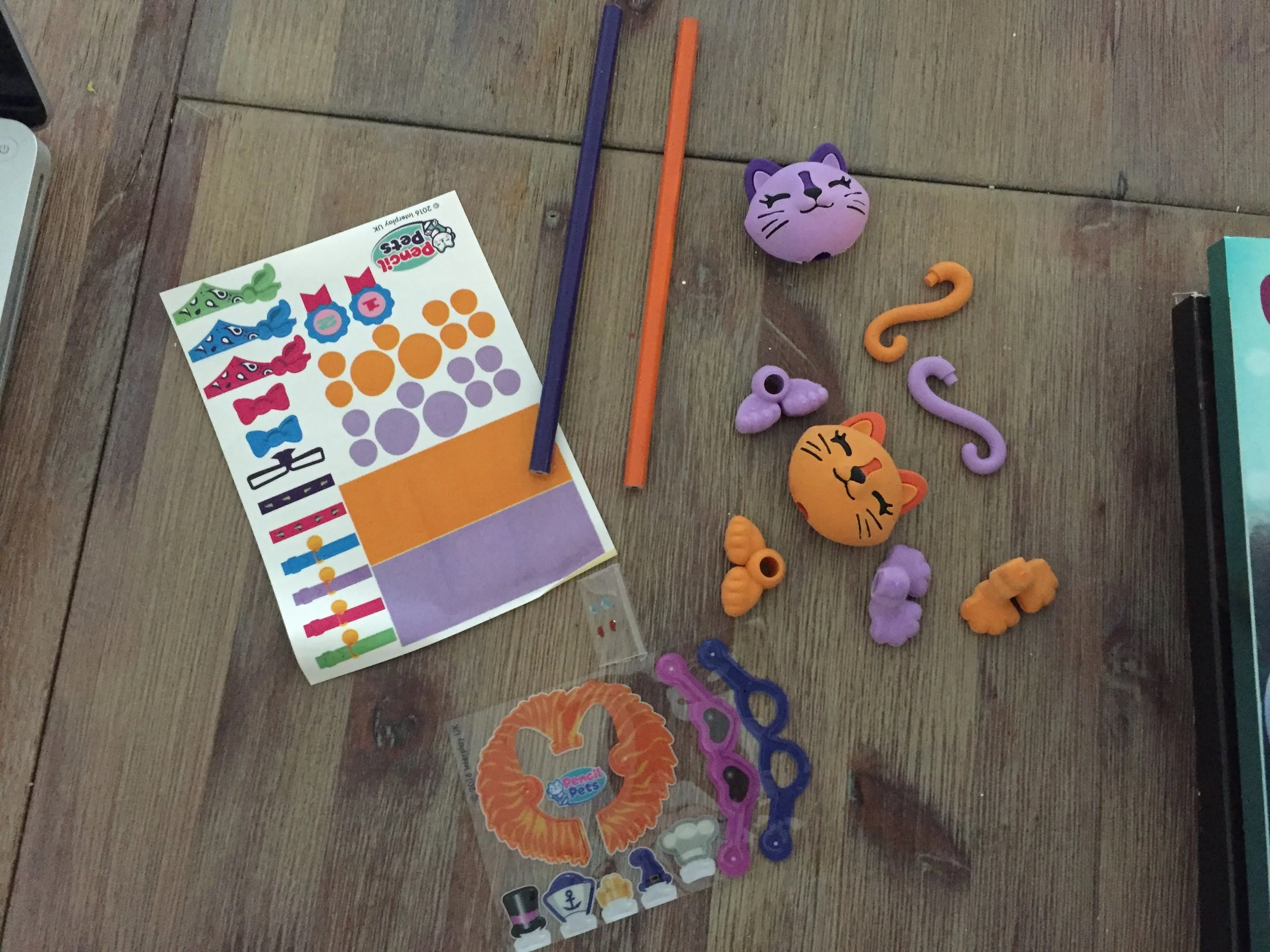 A Purple and Orange pencil, the toppers and add-ons are included, which allows you to build/create and change the eraser body parts. The head (pencil topper) of the pet separates, and this allows you to accessorize your pet with hats, glasses, lion mane, etc.