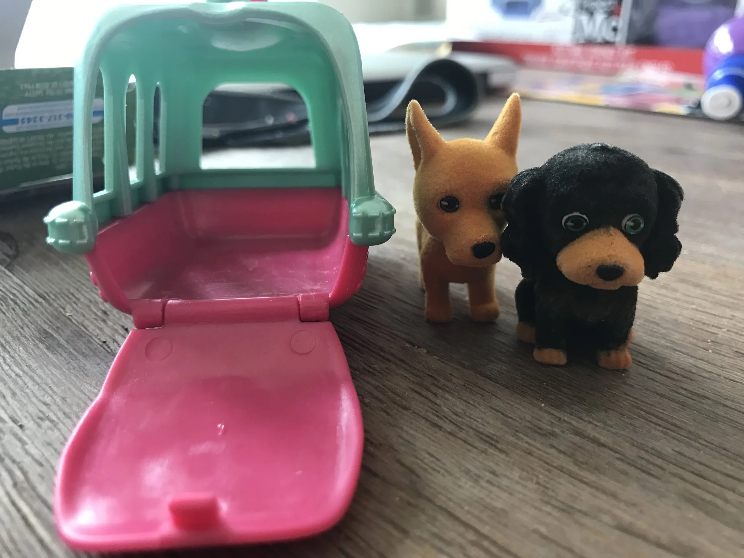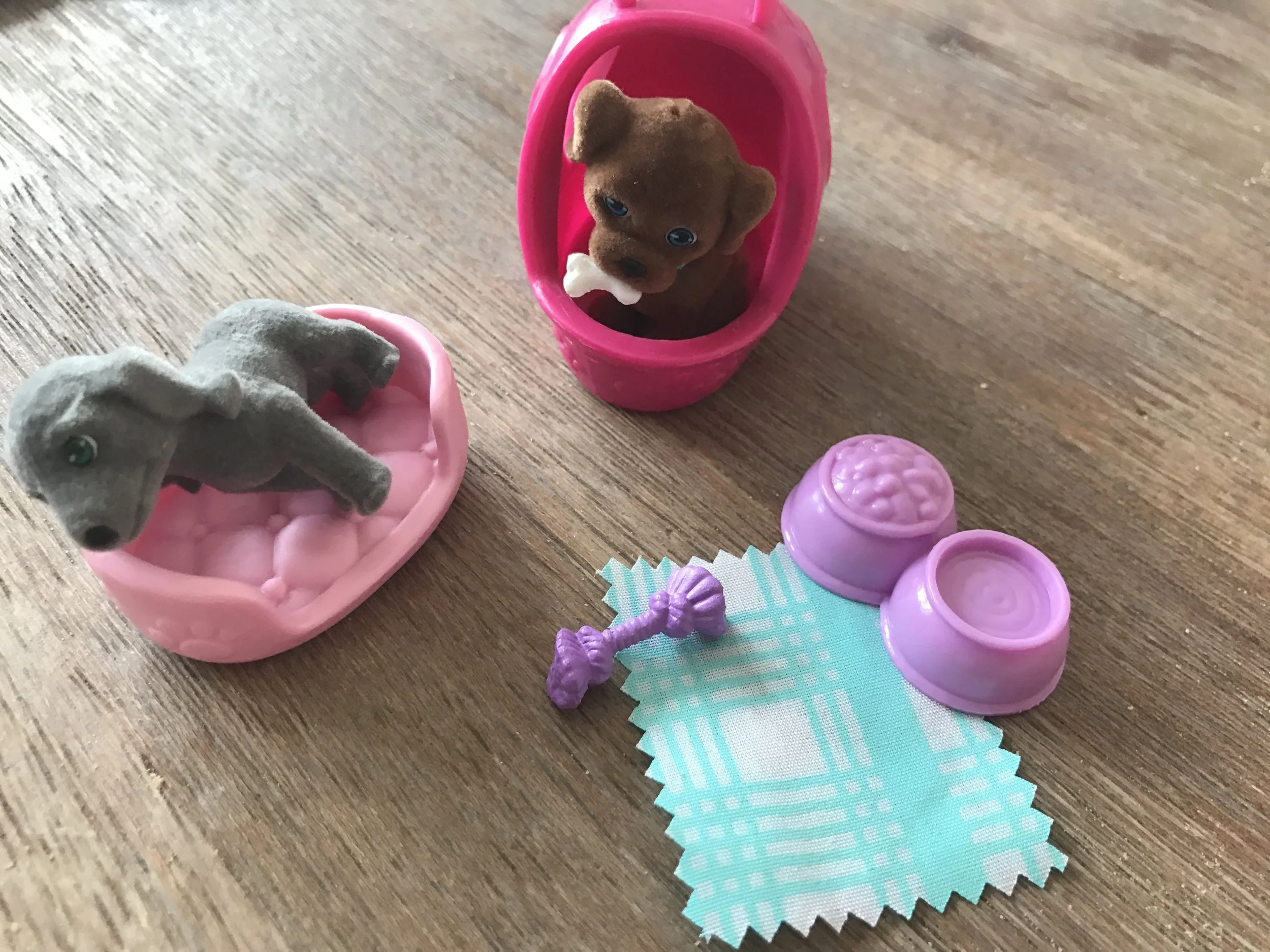 Puppy In My Pocket Puppy Carrier Accessory pack - The 8 piece set comes with 2 collectable pups, one puppy carrier, bed, blanket, double dish, a treat and a collector's checklist! There are three styles available to collect - pink, purple and teal. This pack was lovely, Summer loved putting all the pieces together and creating her play with the puppies.