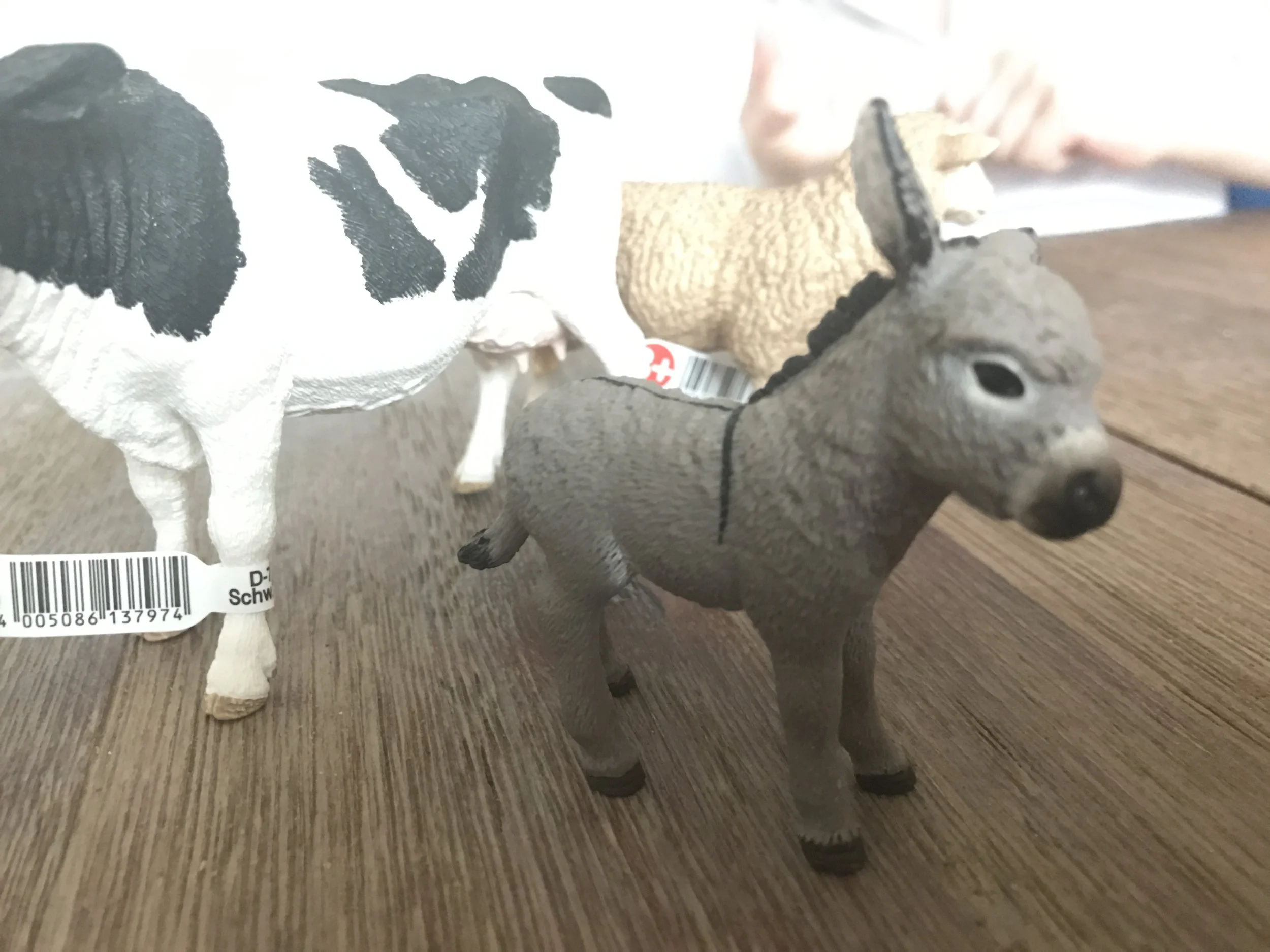 We received the Schleich Farm World Starter Set for review. This beautiful set of farm animals includes: a cow, a sheep, a donkey and a cockerel.