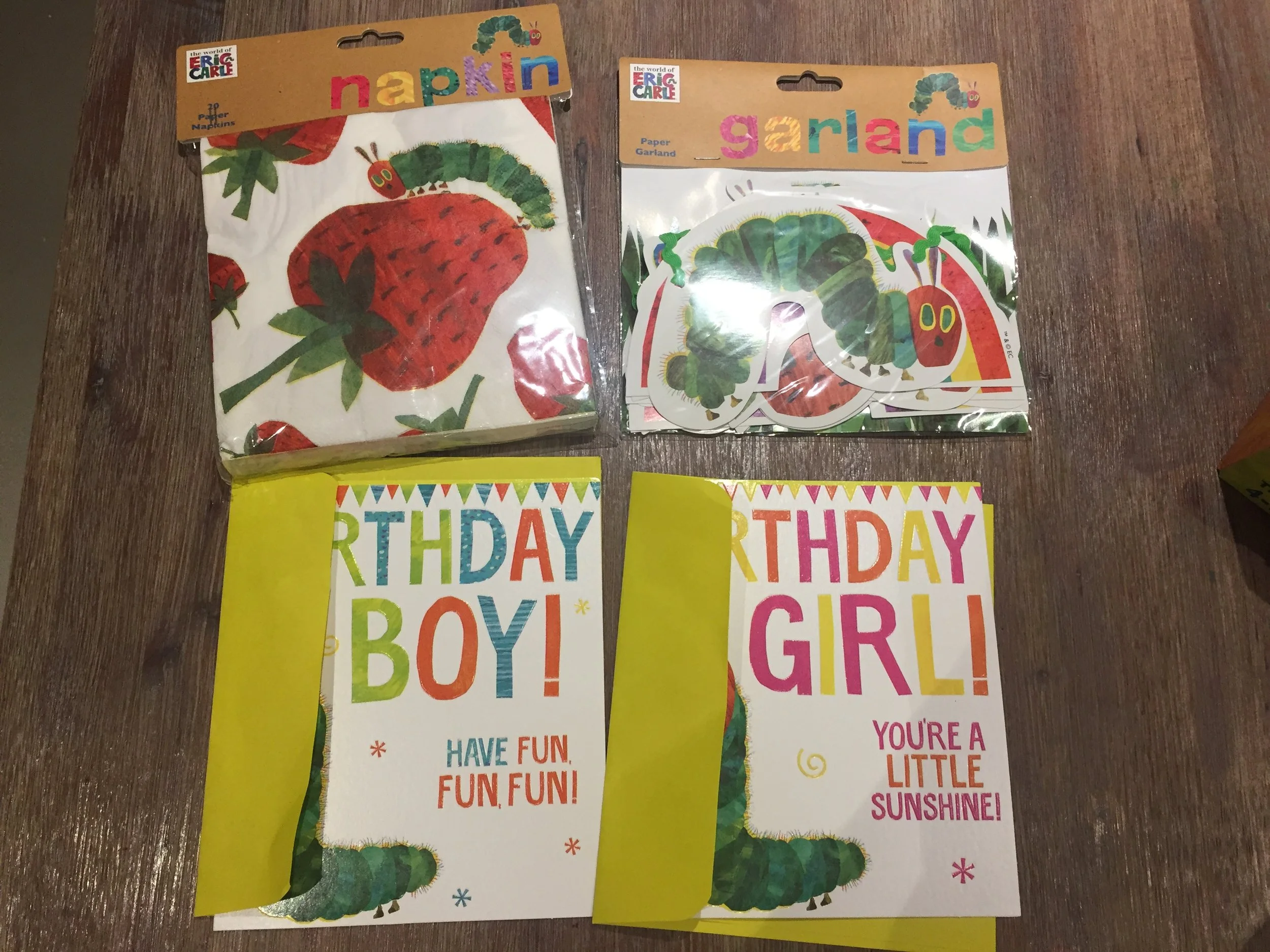 These items continue with the birthday theme, the range includes partyware for themed party celebrations. The garland is 3m has sixteen different images which are all beautifully illustrated. The pack of 20 x 3 paper table napkins feature strawberries and The Very Hungry Caterpillar.