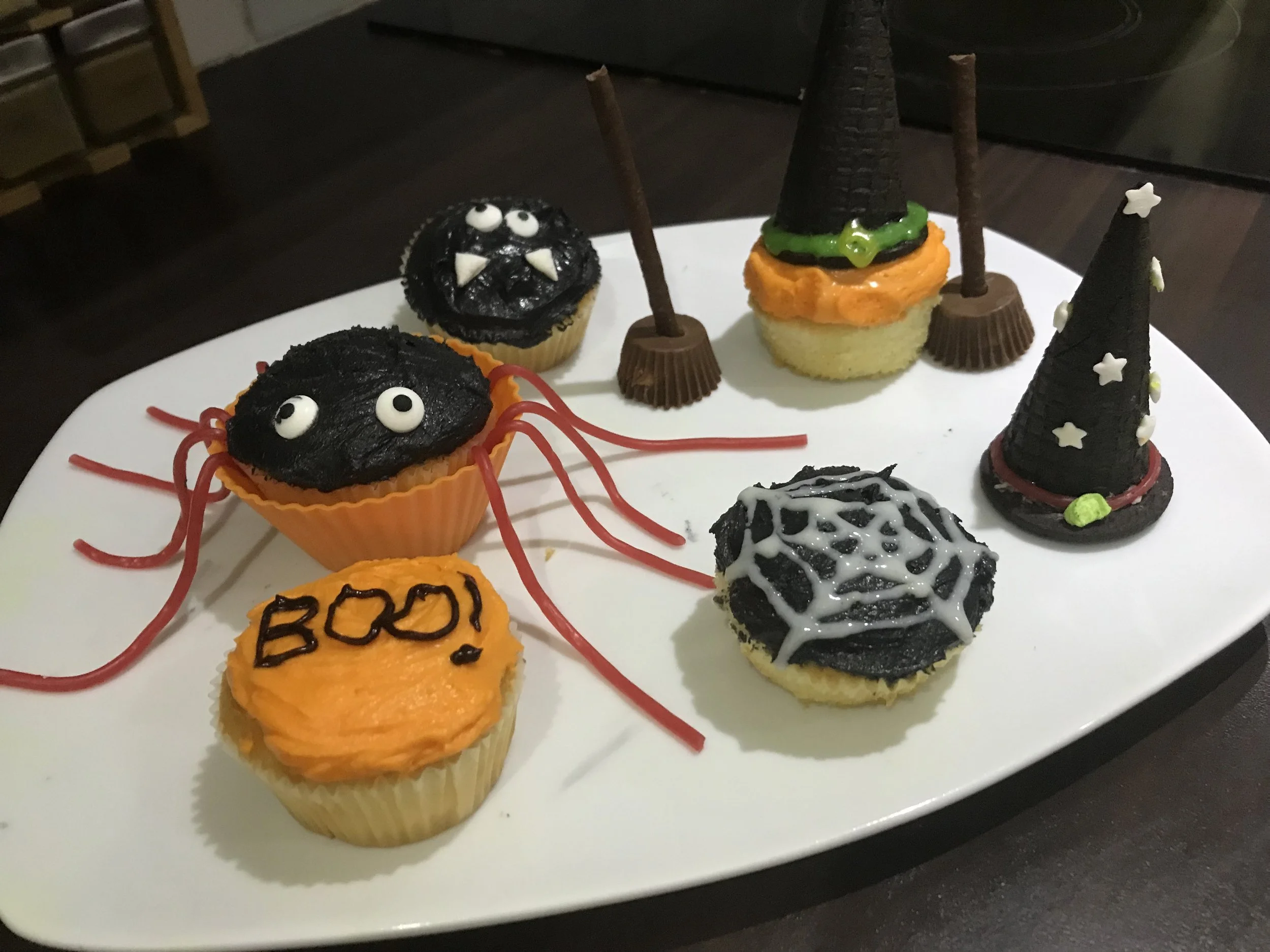 We used the different colouring icings - Orange and black. White frostings, edible eyes and mini marshmallows.
