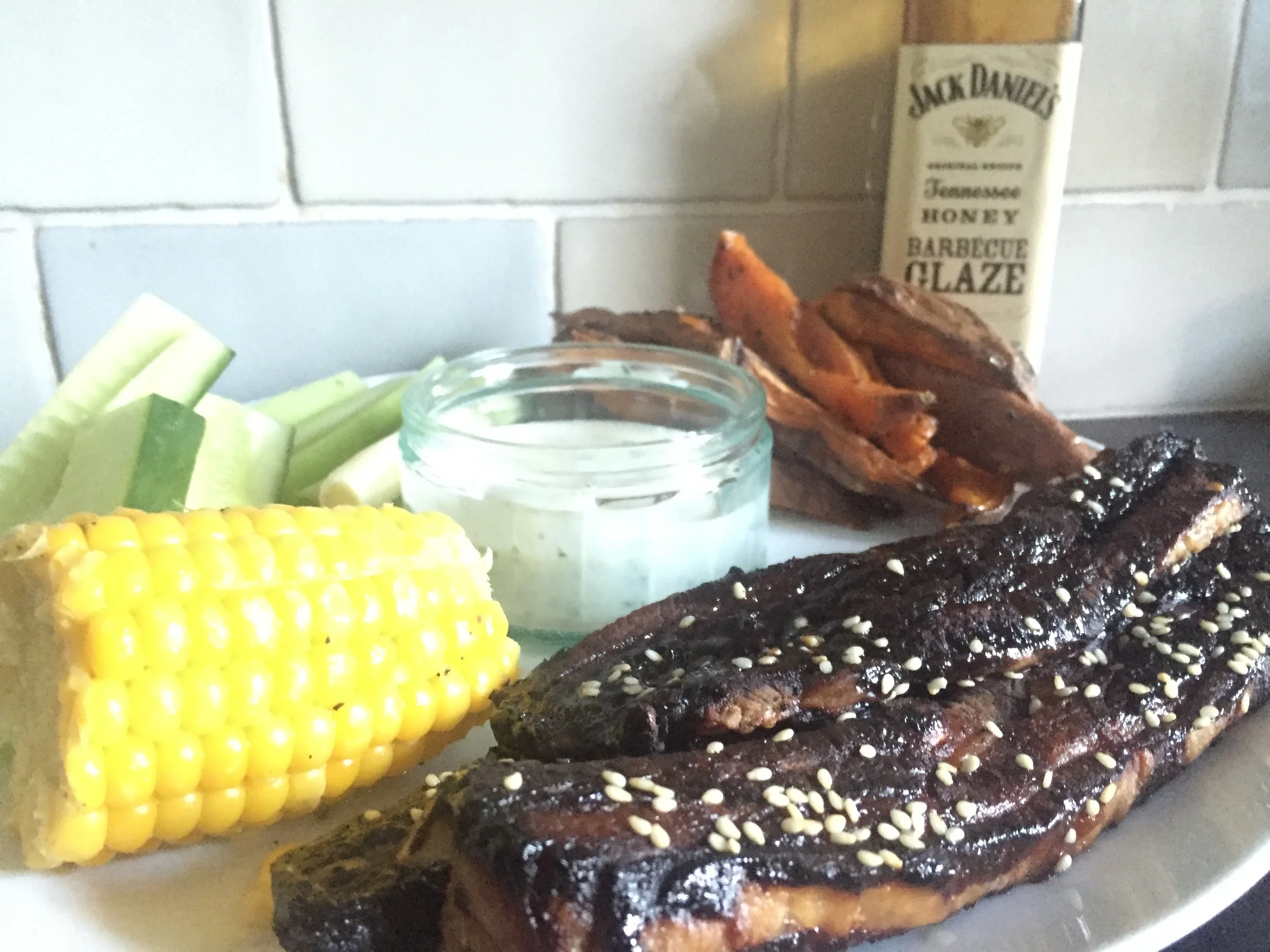The ribs are delicious. Sweet, full of flavour and a nice treat. I served them with sweet potato chips, sweetcorn, celery and cucumber. I made (my new favourite dip) chive dip, which is very refreshing and tasty and compliments the ribs perfectly.