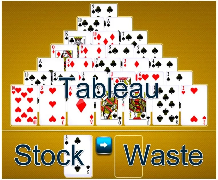 Well, you start with a ‘pyramid’ of 28 cards, with the rest of the cards left on the deck. Your objective is to clear the entire pyramid by matching pairs of cards where the value adds up to 13. e.g, a five and an eight, from any suit, totals 13 and will match. Kings have a value of 13, Queens value is 12, Jacks are 11, and Aces 1.